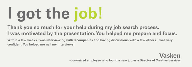Thank you so much for your help during my job search process. I was motivated by the presentation. You helped me prepare and focus. Within a few weeks, I was interviewing with 3 companies and having discussions with a few others. I was very confident. You helped me nail my interviews!